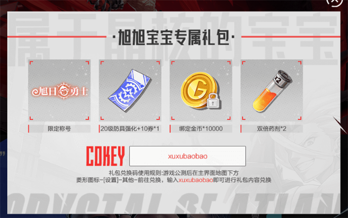 “旭日勇士”限定称号、20级防具强化+10券*1、绑定金币*10000、双倍药剂*2