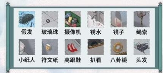 假发、玻璃珠、摄像机、锈水、镜子、绳索、小纸人、符文纸、高跟鞋、扒看、八卦镜、头发