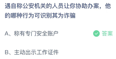 遇自称公安机关的人员让你协助办案,他的哪种行为可识别其为诈骗?这是今日的蚂蚁庄园小课堂的问题,很多玩家都比较关注这个话题,接下来就让小编为大家详细介绍一下,希望可以帮助到大家。