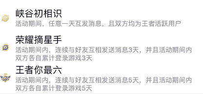 荣耀摘星手:活动期间内,连续与好友互相发送消息3天,并且活动期间内双方各自累计登录游戏3天;