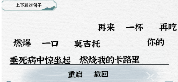 3、虽然这两句话看起来毫无关联,但是连起来读却非常的顺口,玩家只要将燃烧我的卡路里拼起来放在后面即可。
