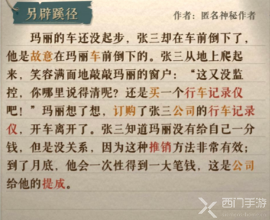 玛丽的车还没起步,张三却在车前倒下了,他是故意在玛丽车前倒下的。张三从地上爬起来,笑容满面地敲敲玛丽的窗户:“这又没监控,你哪里说得清呢?还是买一个行车记录仪吧!”玛丽想了想,订购了张三公司的行车记录仪,开车离开了。张三知道玛丽没有给自己一分钱,但是没关系,因为这种推销方法非常有效,到了月底,他会一次性得到一大笔钱,这是公司给他的提成。