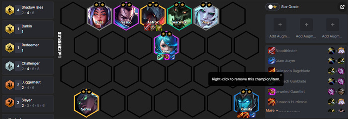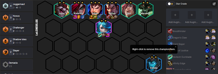 推荐理由:高挑战阵容,依靠格温和卡莉斯塔双C,五费剑魔顶在前面,阵容强度高,且容易成型,前期有卡莉斯塔就很好过渡。