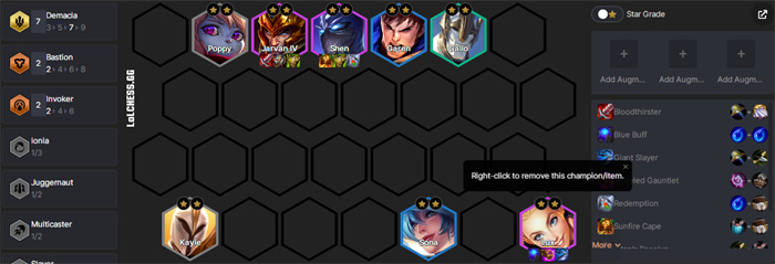 推荐理由:诺克萨斯裁决阵容,依靠卡特和格温的双输出,阵容成型很容易,无需高费卡,是不错的过渡阵容,后期强度可能稍差。