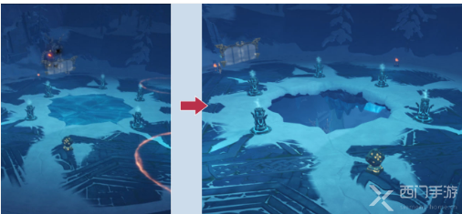 2、用剑【普攻】深赤之石获得能量,再【普攻】忍冬之树,融化树木的冰(深赤之石c在忍冬之树旁边);