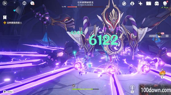 在全是紫气的房间打完怪,靠近绿色的“树叶”状传送,再传送一次,打掉boss,散兵可以借助e技能升空+空格键拉升高度,躲boss技能。