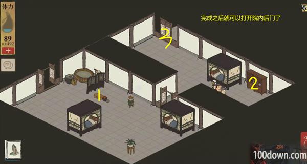 3、钥匙三:进入猎户家,进入房间后按照下图顺序一次点击储物盒、橱柜、卡主的房间,走到后门找到宝箱;