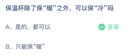 保温杯除了保“暖”之外,可以保“冷”吗?这是今日的蚂蚁庄园小课堂的问题,很多玩家都比较关注这个话题,接下来就让小编为大家详细介绍一下,希望可以帮助到大家。