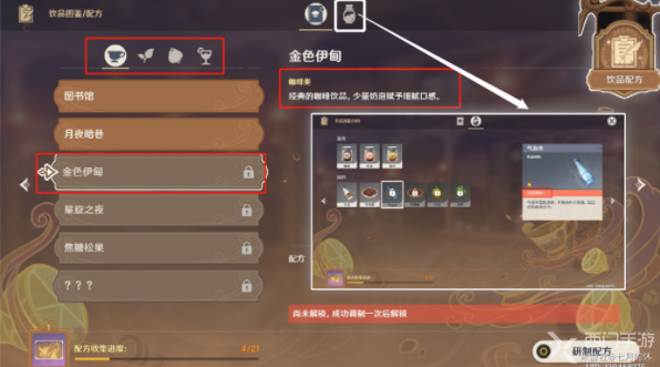 3、点击配方→未解锁饮品→查看解锁条件→根据解锁条件,选择合适的基底和辅料,成功调制,即可解锁饮品配方。
