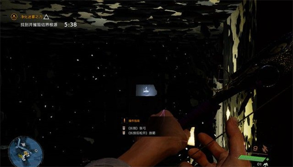 4、在尽头的位置可以发现更加远的地方,按R取出弓箭,将远方的节点射掉就可以了;