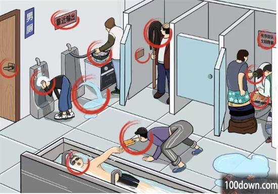 3、厕所有【砂纸】,划动左侧第一个隔间门,点击墙壁上的砂纸及人物即可点击【迷惑墩布】,向左划动右侧第一个隔间门,点击【马桶烧烤】即可,将砂纸拖动到最右侧隔间墙壁伸出的手上即可触发【来点纸】,图中有人在洗手池里面游泳,左边有人在小便池里面洗头,还有人在厕所里面做饭。