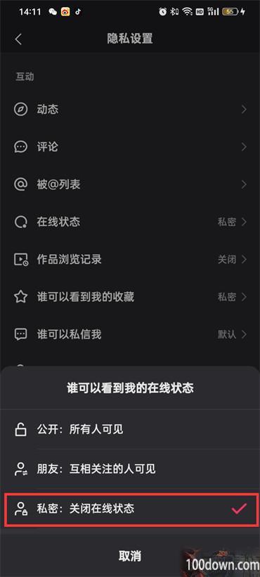 5.最后在页面下面弹出的对话框中点击【私密:关闭在线状态】即可;