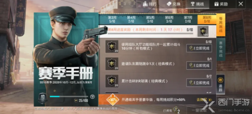 赛季手册的每周挑战只有最后几天啦,完成最后一周(第八周)的任务,可获得500积分,特种兵们赶紧冲起来!