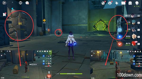 ②击败第一个区域的怪物后,使用机关开启闸门来到第二个区域,击败怪物后,打碎图示标记的两处石墙,里面各有一个普通的宝箱,这里是宝箱②和宝箱③。