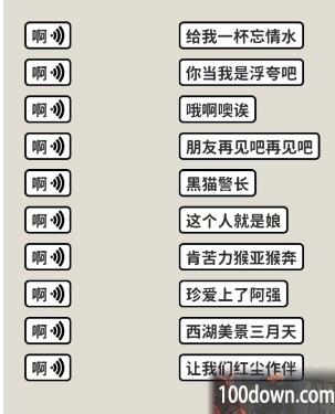 过关方法:玩家还是要听啊的旋律,然后一一辨别是哪一首歌,啊字不太好听出来,如果不行多听几遍,或者直接看下方答案。