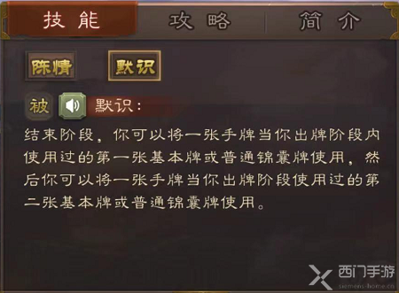 默识--结束阶段,你可以将一张手牌当你出牌阶段内使用过的第一张基本牌或普通锦囊牌使用,然后你可以将一张手牌当你出牌阶段使用过的第二张基本牌或普通锦囊牌使用。