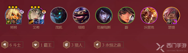 阵容英雄:努努、艾希、树精、塔姆、厄斐琉斯、蔚、狼人、瑟提