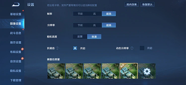 3.在图像设置界面在帧率选项后面点击【超高】,在下面的画面总质量位置选择最后一个选项,设置完毕返回首页;