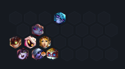 5、站位图:站位上让薇古丝独立在前排,其他的约德尔和魔法师们在后排集中站位,这样可以避免被天敌刺客等英雄切入,只需要撑到小法释放一次技能即可结束战斗。
