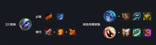 4、装备搭配:【小炮】羊刀+巨杀;【薇古丝】小反甲+龙牙+狂徒;【维迦】复活甲+科技枪+法爆。约德尔一旦成型有了维迦之后只需要维迦一个就可以清理战场,但是前期也需要一定过渡,而薇古丝在前排,小炮在后排可以很好卖血,不至于撑不到后期。
