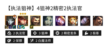 2、羁绊:2执法官、3狙神、2精密发条、2极客、2保镖、2白魔法师