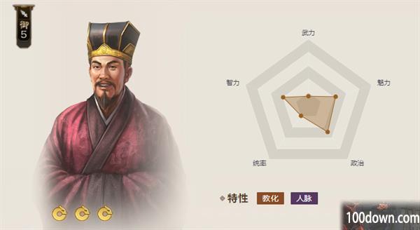 孔伷拥有很高的魅力。政治发展也还好。智力,武力也发展平衡,委任为主政官(政厅)或采石官(采石处)时,石料产量提升。其全面的技能属性可以应对多种战场环境。