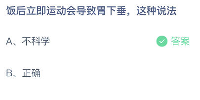 饭后立即运动会导致胃下垂,这种说法?这是今日的蚂蚁庄园小课堂的问题,很多玩家都比较关注这个话题,接下来就让小编为大家详细介绍一下,希望可以帮助到大家。
