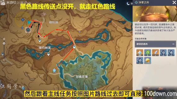 2、之后跟着下图的路线前往寻找净罪之井秘境,找到之后直接开启就可以,不用解谜;