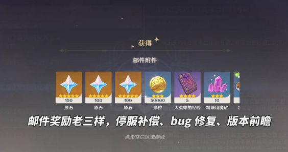 3.9/4.0版本前瞻(咱也不知道下一个到底是啥),300原石;往期bug统一修复,300原石;3.8版本更新停服补偿,300原石。