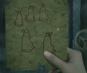 13、来到千书阁,中间书架的位置上面有三个底座,非礼勿视,非礼勿听,非礼勿言,把三个猴子雕像摆上去,一张纸条。