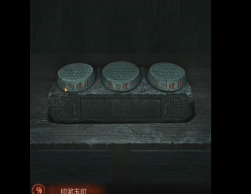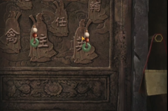 12、切换女性视角,机巧阁龙头上面宝石颜色如下图,得到玉印,千书阁桌上有印泥,获得印泥玉印,屍解居门联缺少了一个字,把它盖在屍解居右边的门联上,获得猴子雕像。