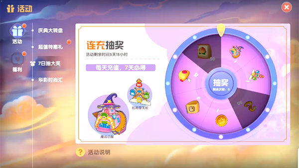 魔法小屋是7日连充抽奖的奖励之一,连续充值抽奖获得,每次充值可获得一次抽奖机会,被抽到的奖励无法重复抽取,连续7次必得。