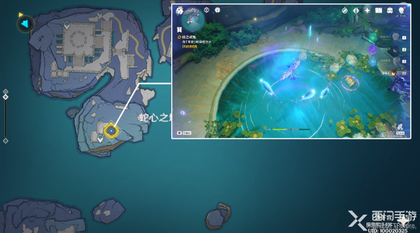 2、到达该位置后同样是调查池水,利用冥鱼飞到上空的虫洞,进入虫洞后和屏障前面的残魂进行对话接受试炼任务;