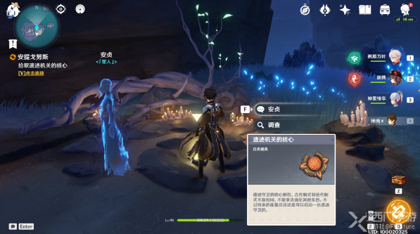 4、遗迹机关的核心就在安贞的身边,靠近三角标的位置点击交互调查就可以获得遗迹机关的核心道具;