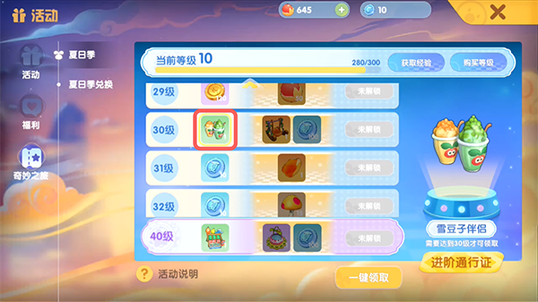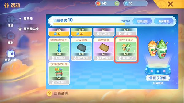 3.在夏日季活动中,提升等级至30级可获得,可通过每日任务打开宝箱获得夏日季经验值来提升等级;