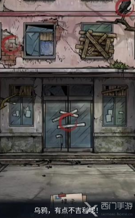 1、进入关卡可以看到一个废旧的宿舍楼中,在这个图片中找到左上角【破旧的墙壁】、右右上角的【乌鸦】和门上【封条】;