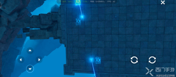 4、随后操作机关调整光线位置照射对面平面大字体,这俩柱子是操控光线机关;
