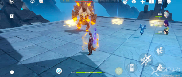 2、之后随便进入旁边传送门前往旁边平面的机关处,这里推荐使用护盾角色去踩小字体,因为猜错字体会收到伤害,踩完小字体后会出现怪把怪清掉后会出现机关;