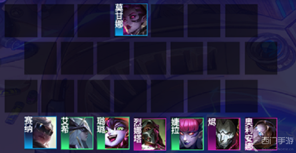 1、阵容组成:莫甘娜+璐璐+艾希+婕拉+烬+赛娜+奥利安娜+烈娜塔