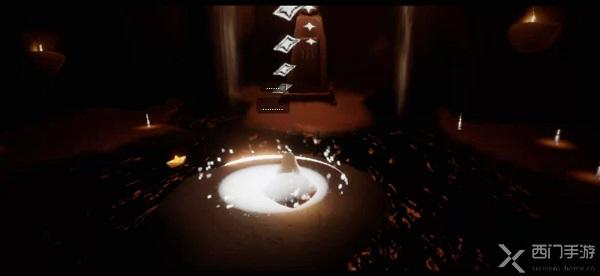 3.第一个石台蜡烛的位置在正前方,水面下降我们就可以看到,快速跑过去点亮蜡烛,上升地面;