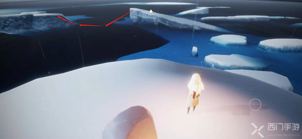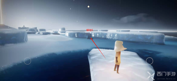 7.来到半圆冰岛的另一边,我们可以看到几个浮冰,之后需要依靠浮冰前进,首先到第一个浮冰上,在左上方有一个石台蜡烛;
