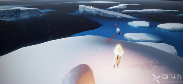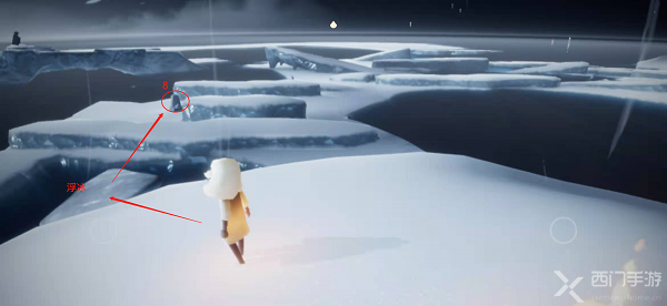 14.在点亮第七个蜡烛后,正前方有一个浮冰,同时在浮冰的前方,有第8个石台蜡烛,先到浮冰上,然后再点亮蜡烛;
