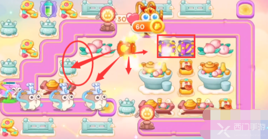 2、火瓶先往右清理道具,清理完放置烟花炮,然后往下清理,清理顺序参考下图:
