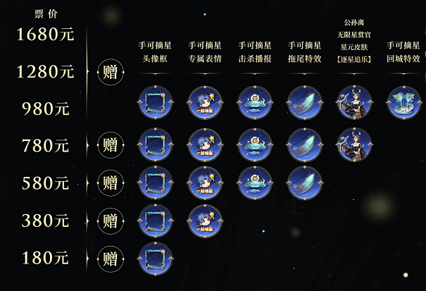 公孙离-无限星赏官星元皮肤逐星追乐,还随票赠送手可摘星回城特效、拖尾特效、荣耀播报、专属表情及头像框等道具,不同票价对应的赠送道具也有所不同,大家可以灵活选择,具体信息请查看保利票务APP购票详情。