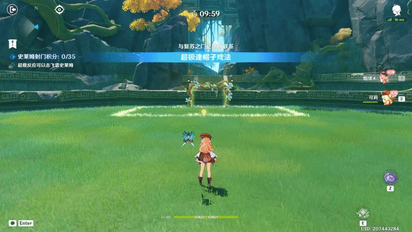 利用烟绯和可莉的攻击触发超载反应,保持图中所示三点一线,将雷史莱姆投入「藤蔓球门」获得积分。