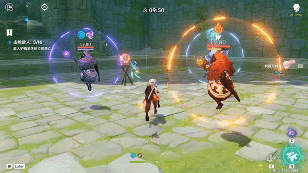 利用万叶的元素战技和元素爆发击破敌人的护盾,万叶靠近火把,使用元素战技,击破护盾,在挑战中,万叶可一直使用元素战技,注意在挑战中,敌人失去护盾会立刻死亡。