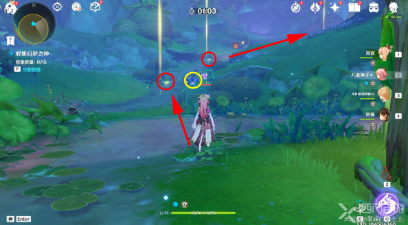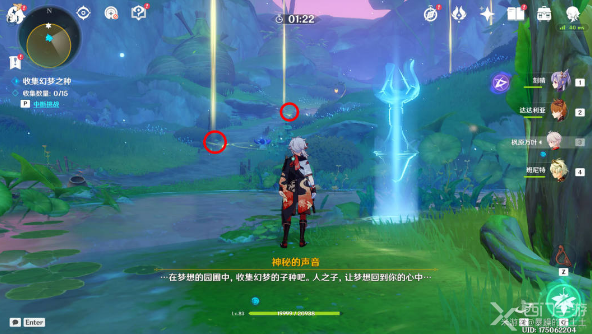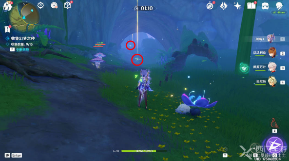 8、穿过圆拱,完成幻梦之种的试炼,收集全部幻梦之种(红圈),跟着下图方向不断找到梦之花(黄圈),就能找齐全部种子了,这个方向是逆时针走的;