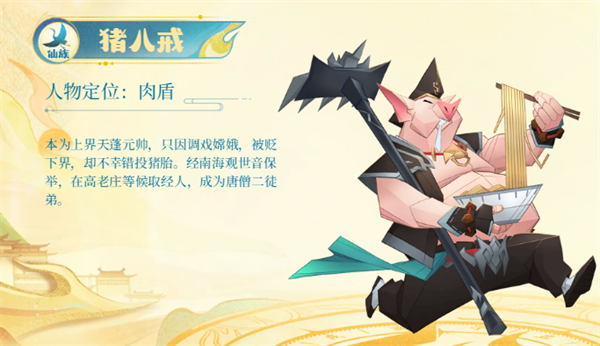 猪八戒是一个力量型的角色,拥有高攻击和高生命值,但速度较慢,他的技能主要是以控制和输出为主,可以对敌人造成大量的伤害并让其失去行动能力,因此,猪八戒是一个非常适合作为前排肉盾的角色;