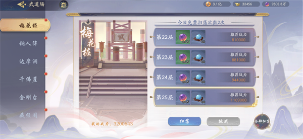 武道场是玩家们获得重要资源的一个途径,玩家们每一天都可以自由的进行扫荡拿资源,资源虽然不多但是可以慢慢累积。