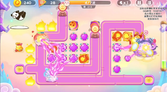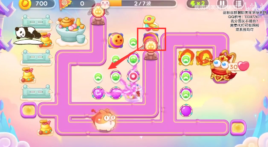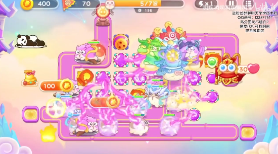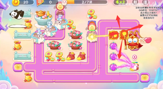2、之后先打兔子,有钱之后在右侧起点正上方的位置放个瓢虫炮,锁定左侧区域的道具打,可以清理一大片,左侧清完继续放魔法球,左侧上方放瓢虫继续王座清理;